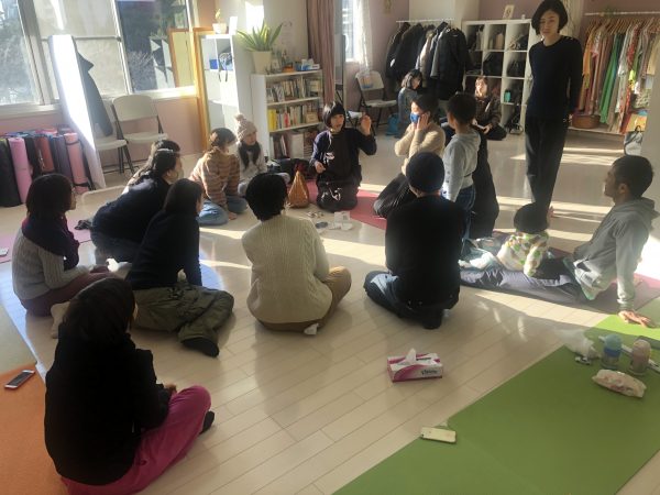 楽しかったです!黒糖にみかん、梅干しなどたくさんありがとうございました!写真はタイガーアンドバスケットのT島さんがマスクの説明をしています。みんな興味津々でした!